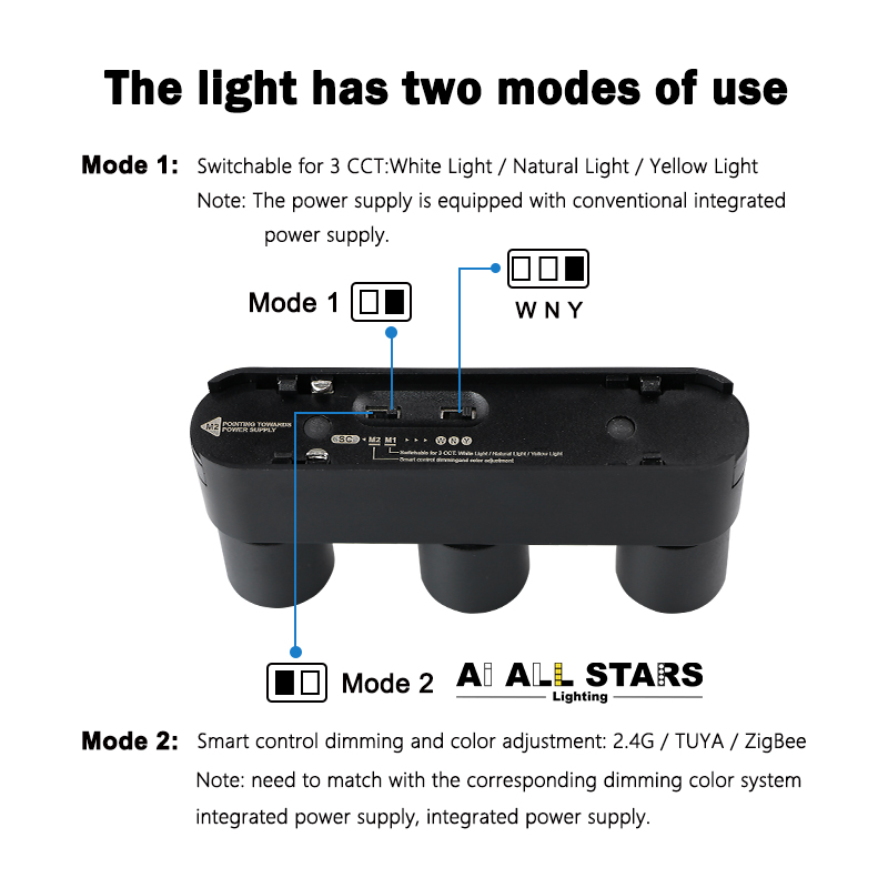 | Design and Functional Features ▪ LED lamps color temperature and brightness for a unified standard module, each lamp can be set by the user's own color temperature, so a set of lamps can be DIY use scene. ▪ Follow the text instructions on the back of the light fixture to find "M1" and "M2" ▪ When sliding to "M1", you can control the right "Y", "N" and "W" 3 gear, dial to "Y" gear is yellow light, dial to "N" gear is natural light, dial to "W" gear is white light. ▪ When the slide to "M2", the right slide function will fail, so that the lamp into the "dimming and color" state, at this time to the track with the corresponding intelligent power supply, you can be dimming and color through the controller. The choice of controller should correspond to the system protocol, such as 2.4G dimming color to use 2.4G remote control or panel, such as TUYA dimming color to use graffiti intelligent APP to achieve control and so on. ▪ Note: power supply is an integrated power supply, there are conventional switching power supply, 2.4G integrated power supply, zigbee integrated power supply etc., the required control mode should be corresponding to it. |