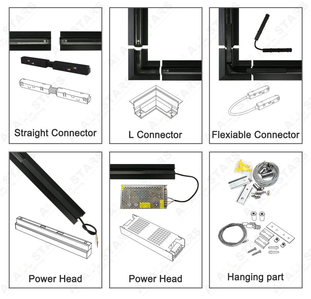 | What Types Of LED Lights Will Be Used On The Magnetic Lighting Tracks? 2. Magnetic Track Light fixture Different light fixture can be available for the 48V magnetic track light system: Magnetic linear profile lighting,Magnetic linear spotlights,Magnetic pendant light,Magnetic directional spotlight,Magnetic track spot ight,Magnet ball light,Pendant ball light,Linear combination lights, Magnetic fill light etc.each light fixture is designed with the magnetic adapter. it means- can be toolfree positioned and repositioned into the track rail, thanks to their magnetic fixation, making it comfortable for the user to adapt the lighting according to the specific setting of the room. Magnet force connects profile and modules both mechanical and electrical. ![]() |