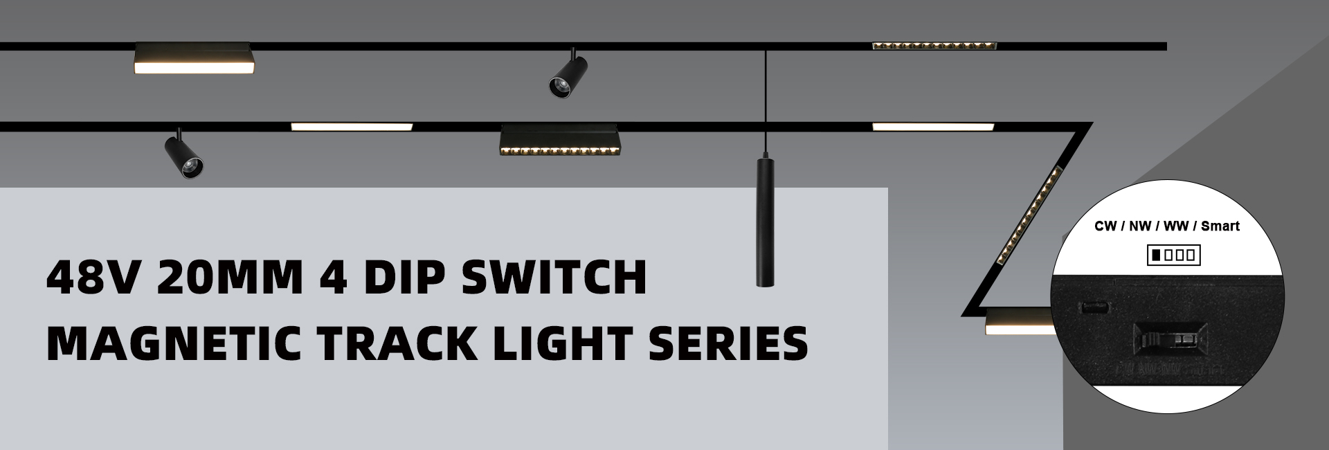 The 48V 4 dip switch magnetic track light series can switch between three light colors: warm white, natural light and cold white. It can also be operated to adjust the intelligent mode. It supports CCT intelligent, Tuya Bluetooth and Zigbee intelligent control, and can intelligently adjust the color temperature of the light on the mobile phone.