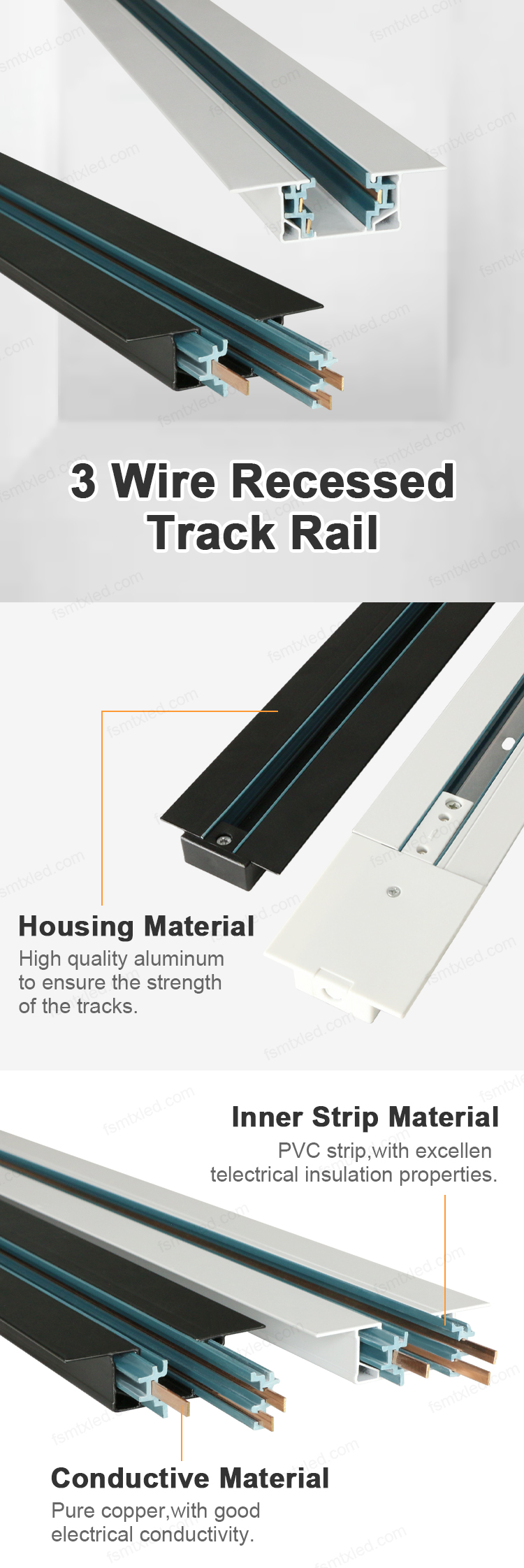 The 3 Wire Recessed Track Rail are made of high-quality materials and have smooth and flowing tracks. They are specially designed for track lights. During installation, with just a few simple operations, the track lights can slide flexibly along the tracks, achieving diversified lighting effects.