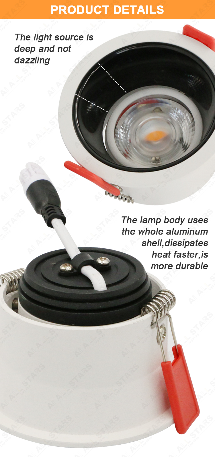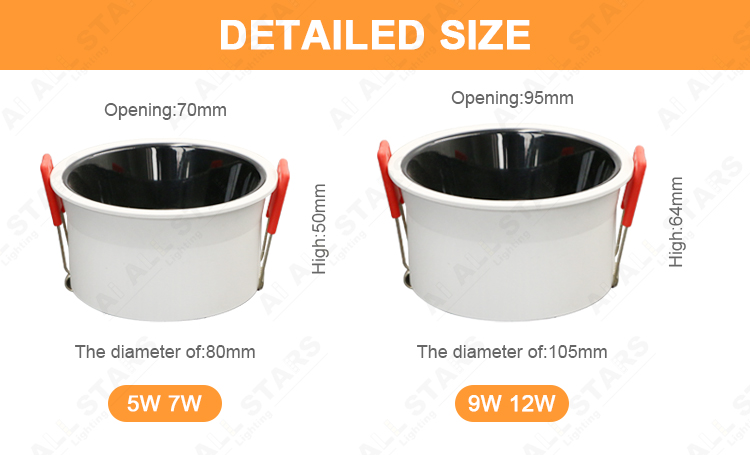 | Product Features: ● Material: Aluminum housing PC diffuser milky cover. Outer trim with deep anti-glare design. ● LED Chip: CREE LED Chips as standard with CRI80, But OSRAM LED with CRI90 is available. ● LED Drive: Intelligent bluetooth led power supply, High-precision components, compatible with a variety of equipment, perfect intelligent control scheme. ● Input voltage:100-240VAC 50/60Hz or 220-240VAC 50/60Hz. ● CCT: 3000K(Warm white ) 4000K(Neutral white) 6000K (Cool white) or Dimmable CCT 3000K-6000K ● Power and Cut size: 5W 7W (75mm ) 9W 12W (95mm ) ● CRI(Ra):>80 (>90 available) Power Factor:>0.5 or >0.9 ● Beam angle:15°24°36° ● Installation: Strong metal springs, easy to do the embedded installation into the ceiling. ● Certificate: CE/Rohs Certified. It is ok to do ETL, UL, CSA, SAA, CB smart down lights if needed. ● Application: Home Office/Hotel/Apartment/Supermarket/Mall/Workshop .etc |