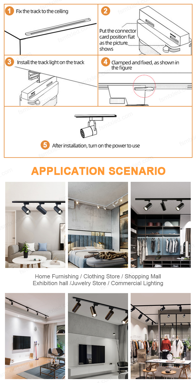 The track lights are compatible with various track bars. The design of the lamp body is exquisite and it features a flexible angle adjustment function. With the help of different track rails, they can achieve diverse layouts, providing precise and variable lighting effects for various spaces.