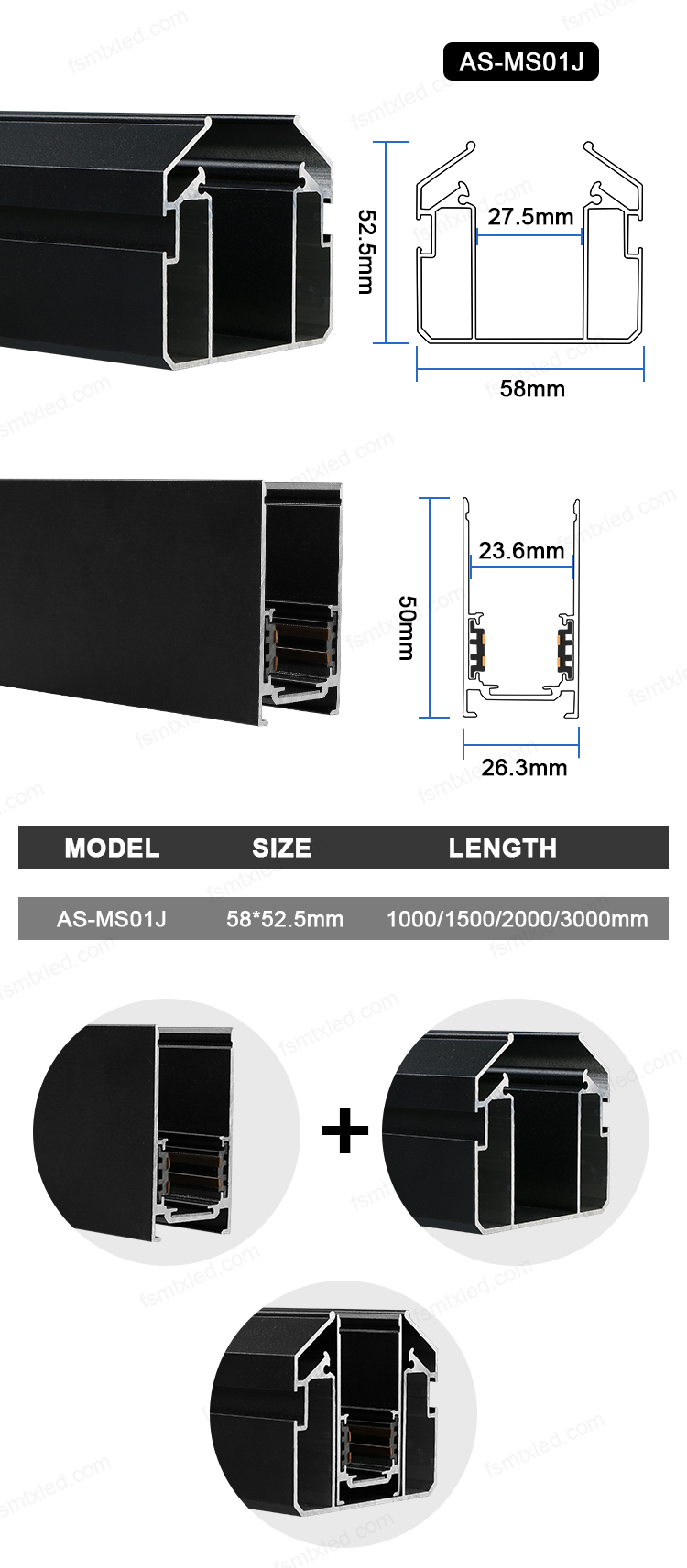 | This is the size information of the magnetic stretch aluminum material AS-MS01J. This is a split-type aluminum material.According to your requirements, you can choose the corresponding length. If you still have any information you want to know, please click the button to contact us. |