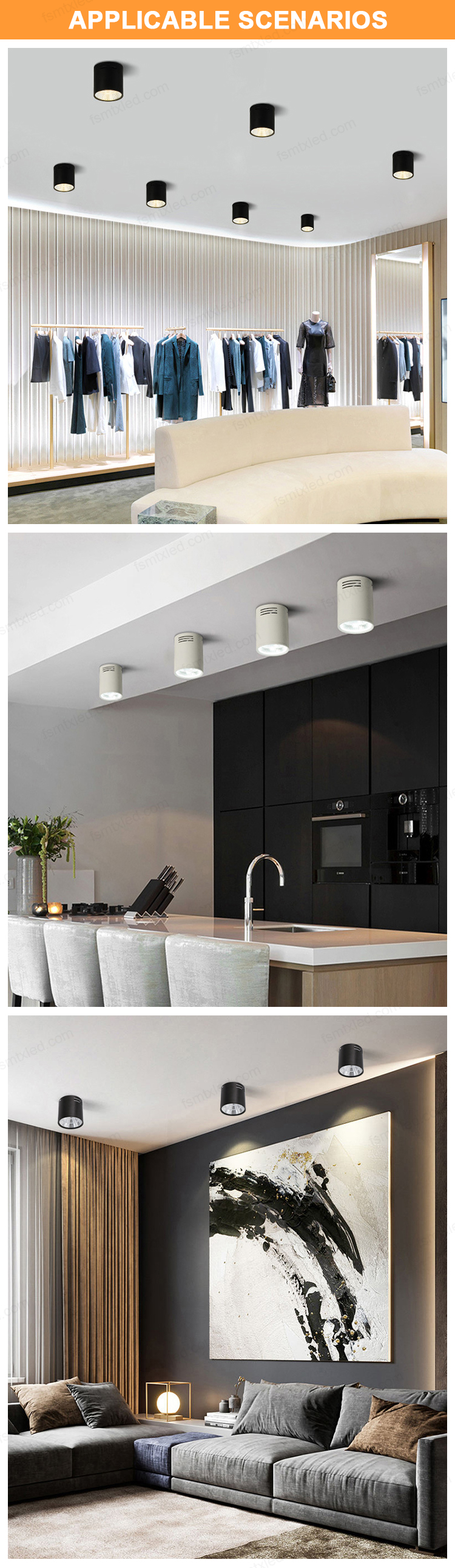 The concealed ceiling-mounted downlights are easy to install. There is no need to cut holes in the ceiling. They can be directly fixed on the surface and quickly illuminate the space. Their light is concentrated and uniform, creating a bright and glare-free comfortable environment for the residence. Moreover, they are compatible with various decoration styles with their simple appearance.