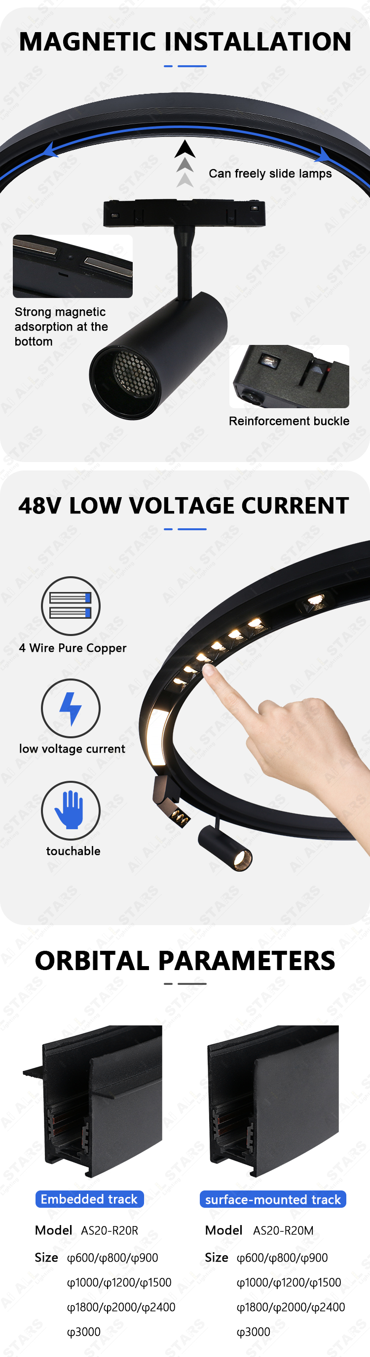 The 48V 20MM Circular magnetic track light series canbe customized for various non-standard tracks , covering arc-shaped, circular, elliptical and other types of line lights and light slot designs. The design of this lamp provides apersonalized effectfor interior decoration and canbe customized according to the size of the ring you want..