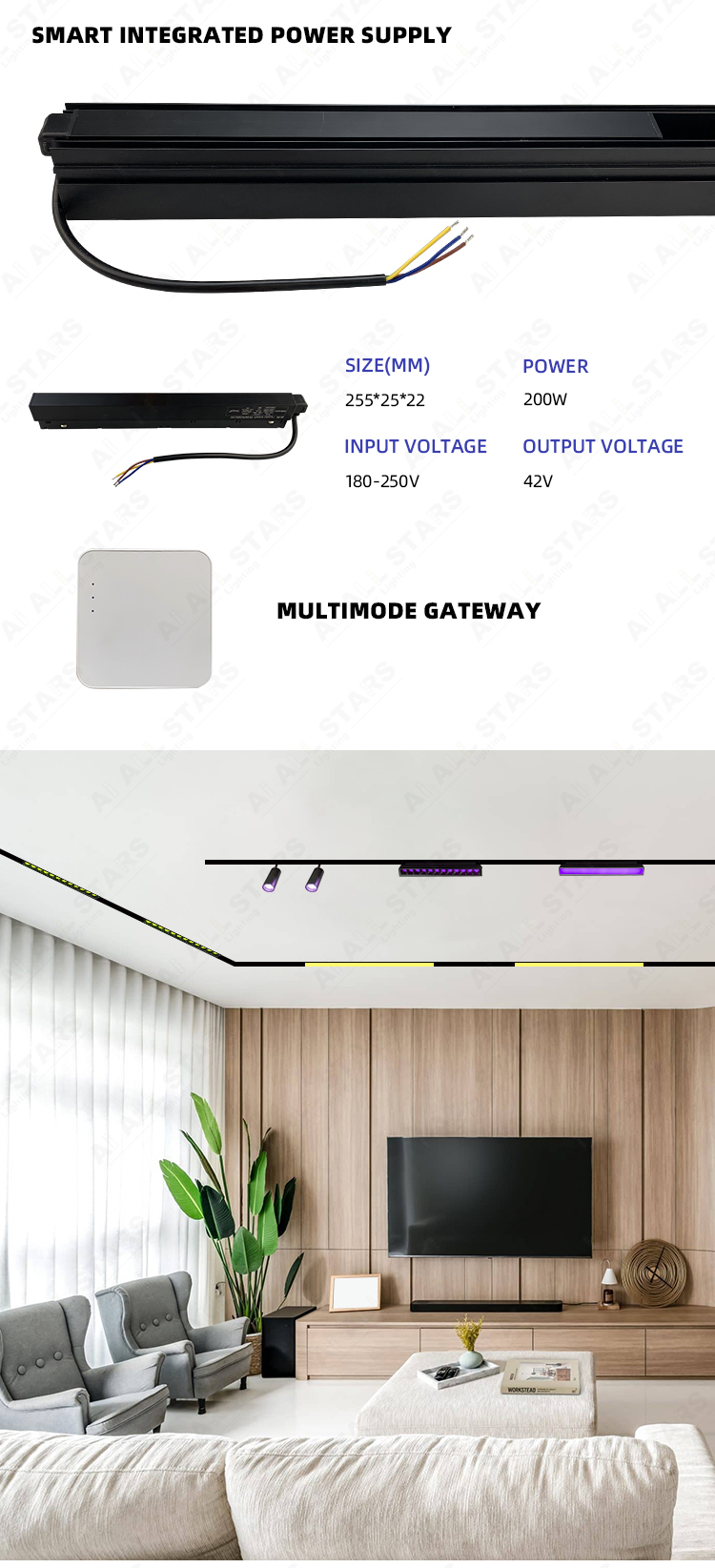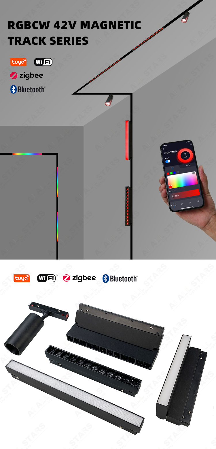 42V RGBCW magnetic track light series. Low-voltage design, within the safe voltage range for the human body, ensuring safe use. Supports RBGCW color adjustment, and also supports intelligent color temperature adjustment from 2700K to 6500K, from warm and soft warm light to clear and bright cold light, easily adapting to the lighting needs of different time periods and scenarios, combining practicality and flexibility.