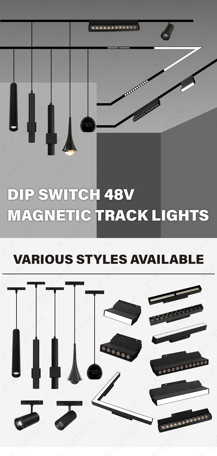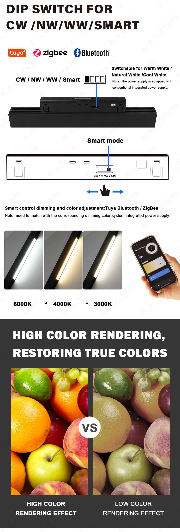 The 48V dip switch magnetic track light series can switch between three light colors: warm white, natural light and cold white. It can also be operated to adjust the intelligent mode. It supports CCT intelligent, Tuya Bluetooth and Zigbee intelligent control, and can intelligently adjust the color temperature of the light on the mobile phone.