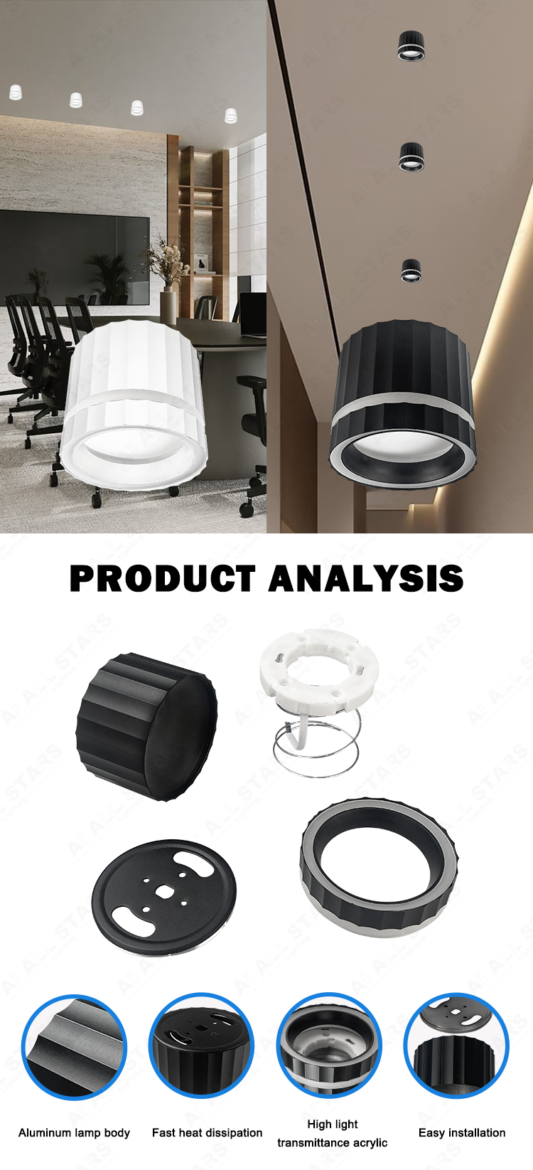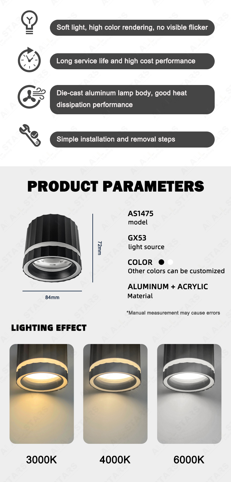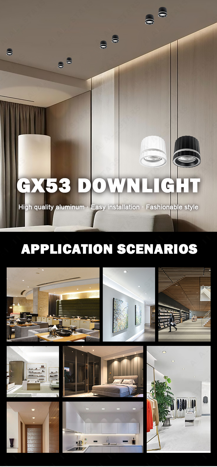 This GX53 led light housing is specially designed for the GX53 light source, with precise interface adaptation to ensure stable lighting. Made of high-quality aluminum, it has strong heat dissipation and corrosion resistance, which can extend the lifespan of the light source. Supports bulb replacement, eliminating the need to replace the entire lamp, reducing maintenance costs and difficulty, and is compatible with various decoration styles.