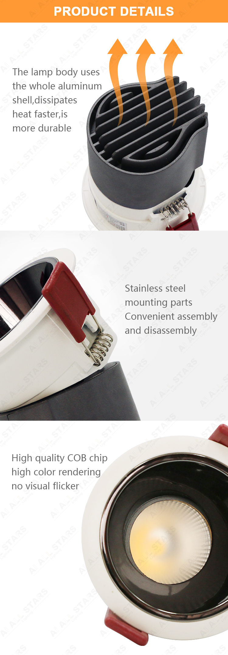 | Product Features: ● Material: Aluminum housing PC diffuser milky cover. Outer trim with deep anti-glare design. ● LED Chip: CREE SMD LED Chips as standard with CRI80, But OSRAM SMD with CRI90 is available. ● LED Drive: Intelligent bluetooth led power supply, High-precision components, compatible with a variety of equipment, perfect intelligent control scheme. ● Input voltage:100-240VAC 50/60Hz or 220-240VAC 50/60Hz. ● CCT: 3000K(Warm white ) 4000K(Neutral white) 6000K (Cool white) or Dimmable CCT 3000K-6000K ● Power : 7W-12W ● CRI(Ra):>80 (>90 available) Power Factor:>0.5 or >0.9 ● Beam angle:15°24°36° ● Installation: Strong metal springs, easy to do the embedded installation into the ceiling. ● Certificate: CE/Rohs Certified. It is ok to do ETL, UL, CSA, SAA, CB smart down lights if needed. ● Application: Home Office/Hotel/Apartment/Supermarket/Mall/Workshop .etc |