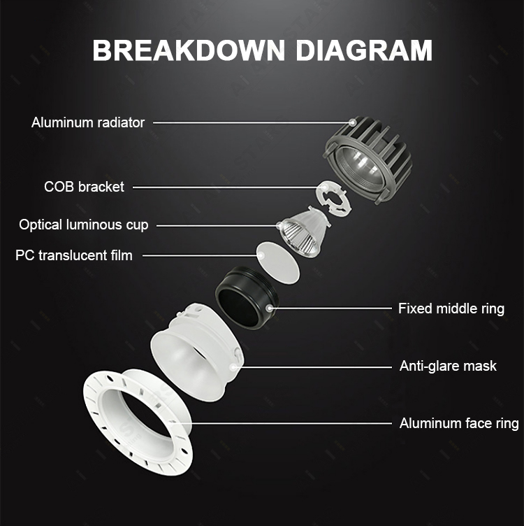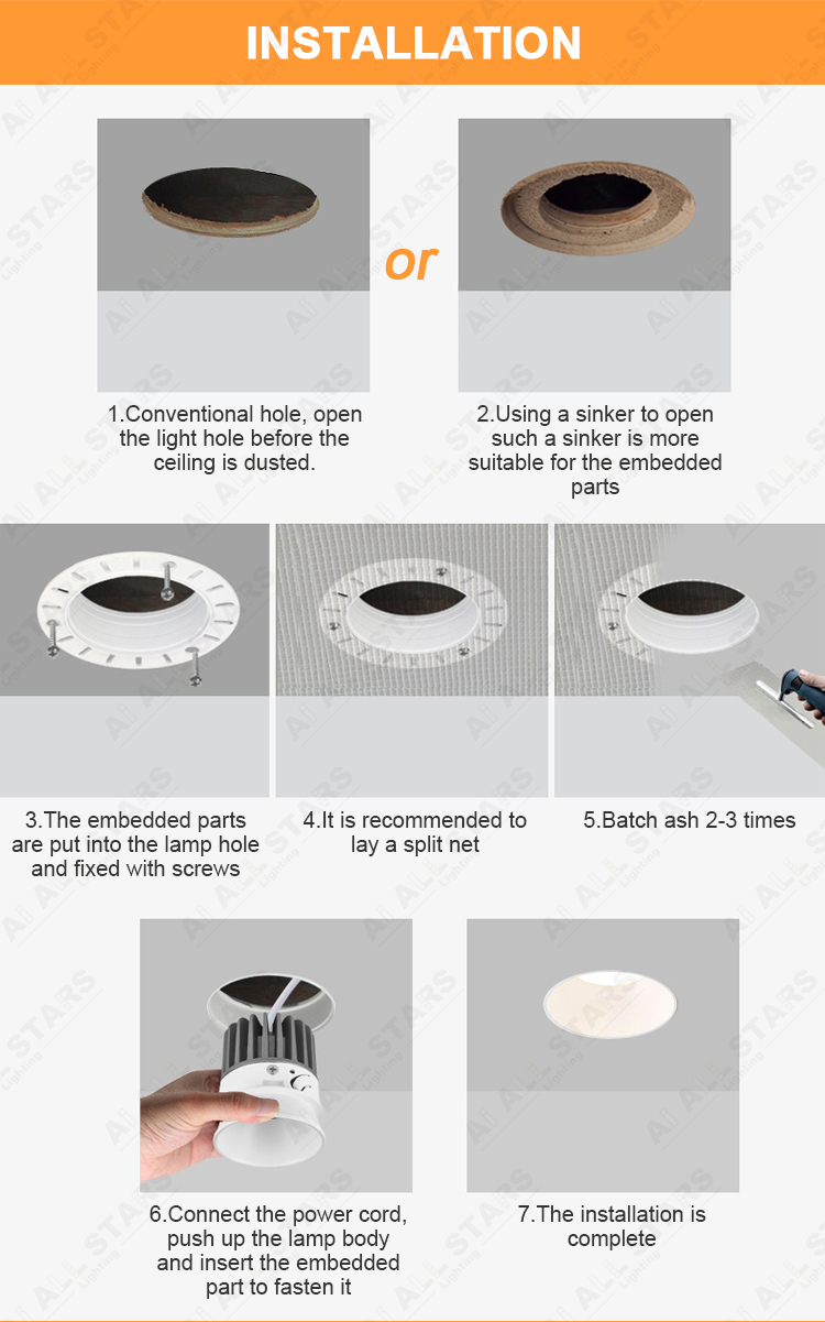| Product Features: ● Material: Aluminum housing PC diffuser milky cover. Outer trim with deep anti-glare design. ● LED Chip: CREE LED Chips as standard with CRI80, But OSRAM LED with CRI90 is available. ● LED Drive: Intelligent bluetooth led power supply, High-precision components, compatible with a variety of equipment, perfect intelligent control scheme. ● Input voltage:100-240VAC 50/60Hz or 220-240VAC 50/60Hz. ● CCT: 3000K(Warm white ) 4000K(Neutral white) 6000K (Cool white) or Dimmable CCT 3000K-6000K ● Power : 7W 8W 12W 15W 20W Cut out: 55MM/75MM/95MM ● CRI(Ra):>80 (>90 available) Power Factor:>0.5 or >0.9 ● Beam angle:15°24°36° ● Installation: Strong metal springs, easy to do the embedded installation into the ceiling. ● Certificate: CE/Rohs Certified. It is ok to do ETL, UL, CSA, SAA, CB smart down lights if needed. ● Application: Home Office/Hotel/Apartment/Supermarket/Mall/Workshop .etc |