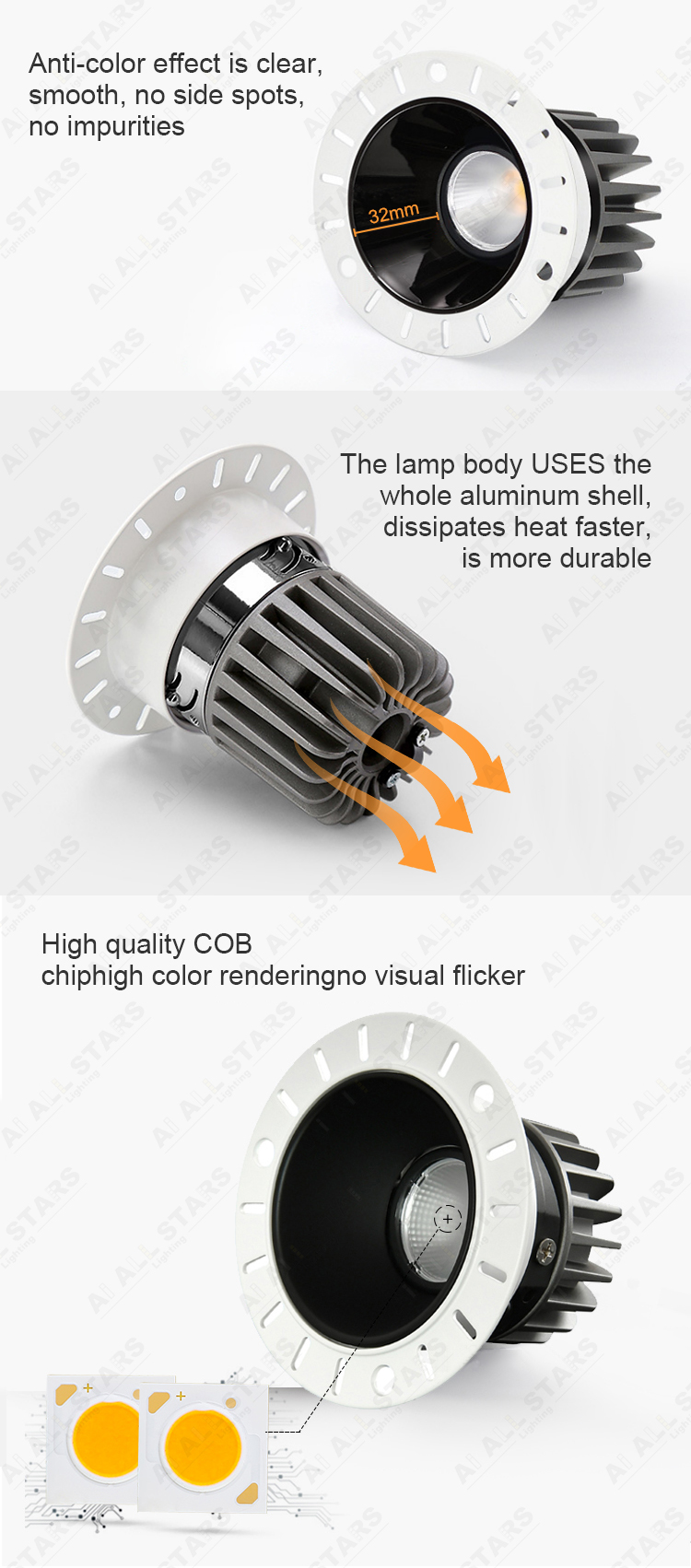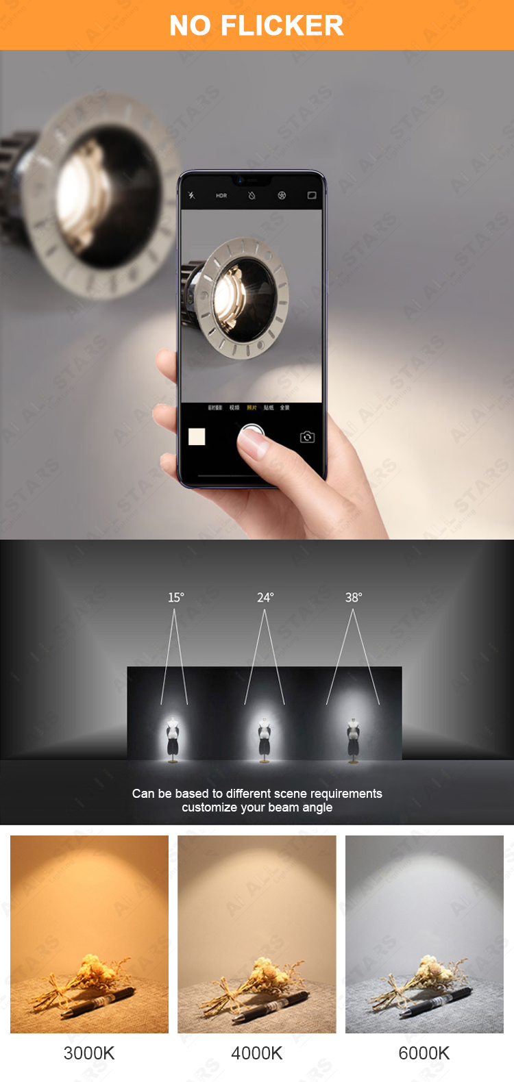 | The LED spotlight is a kind of downlight, which can also be called LED wall washer downlights, it is non-directional lighting, mainly used for accent lighting for museums, libraries, hotels, supermarkets, hospitals, shopping malls, and living rooms, etc. The led spotlights mainly are 15°, 24°, and 36° narrow beam angles, Great for highlighting features of the object being photographed. And its CRI is up to 90. |