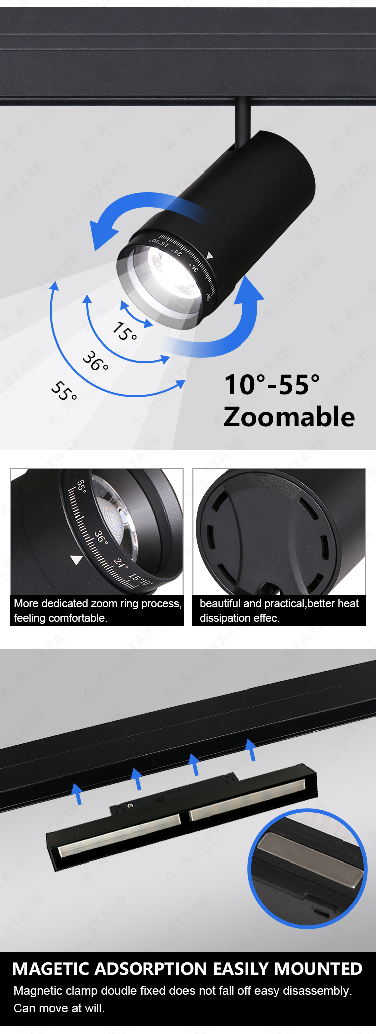 The 48V dip switch magnetic track light series can switch between three light colors: warm white, natural light and cold white. It can also be operated to adjust the intelligent mode. It supports CCT intelligent, Tuya Bluetooth and Zigbee intelligent control, and can intelligently adjust the color temperature of the light on the mobile phone.