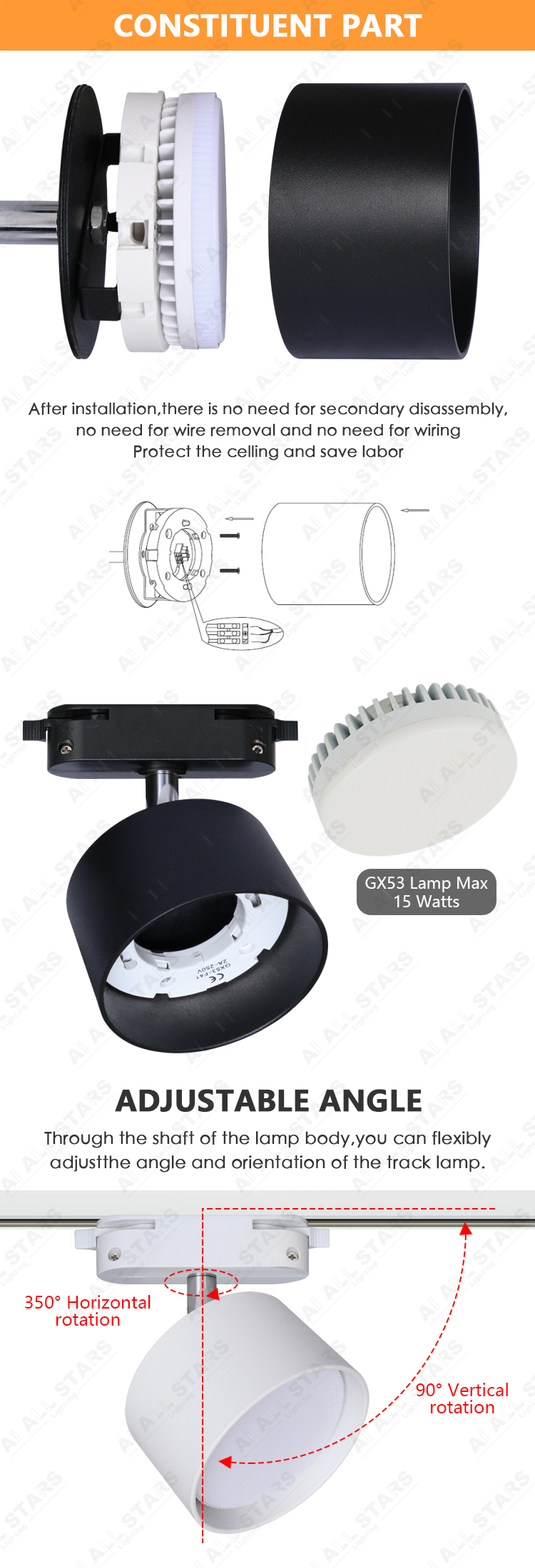 Модель может быть достаточно яркой при использовании ламп 12 ватт и создавать основное освещение за счет широкого угла рассеивания GX53.