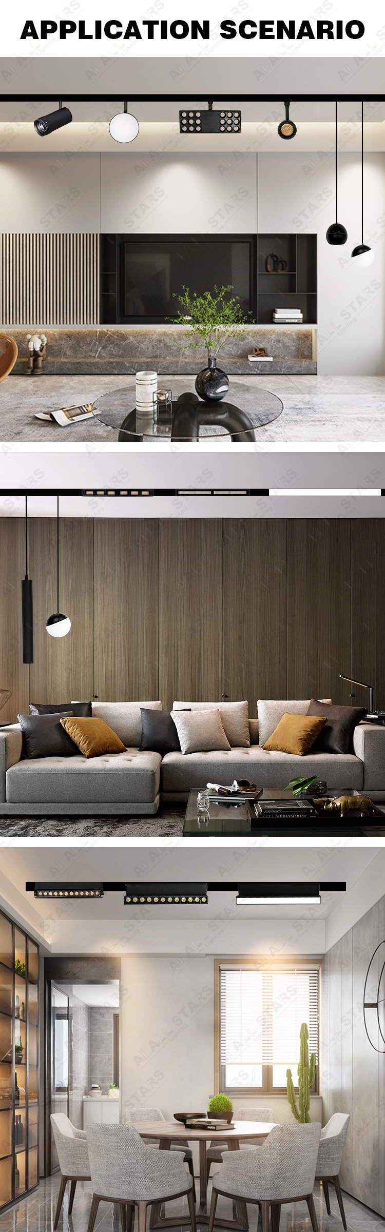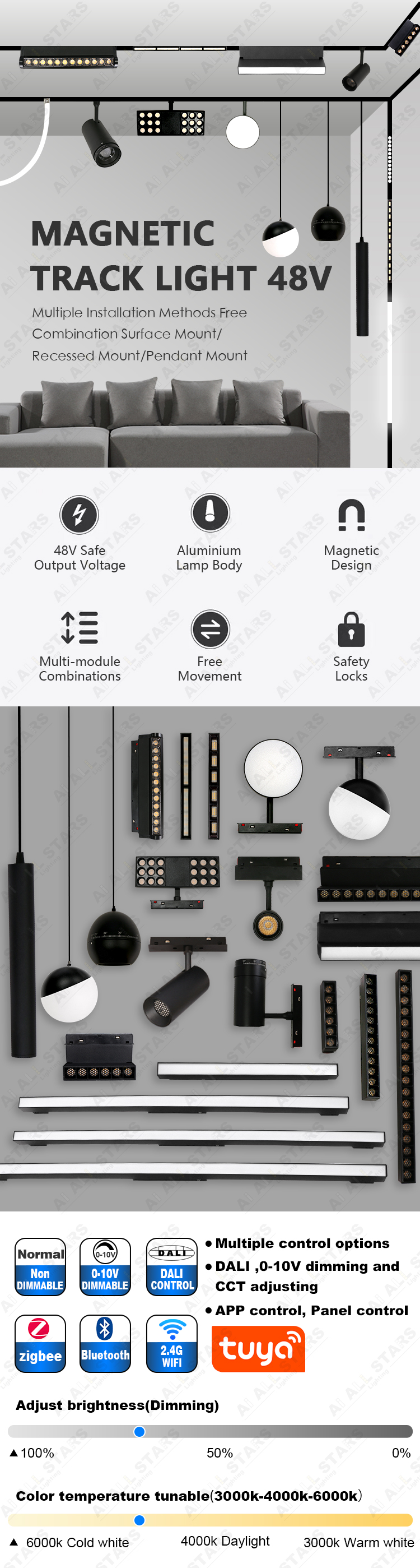 The 48V project magnetic track lights come in various styles. They adopt a honeycomb-shaped anti-glare design and can be produced in black and white series, suitable for large-scale projects such as supermarkets, retailers, restaurants, shopping centers, etc.