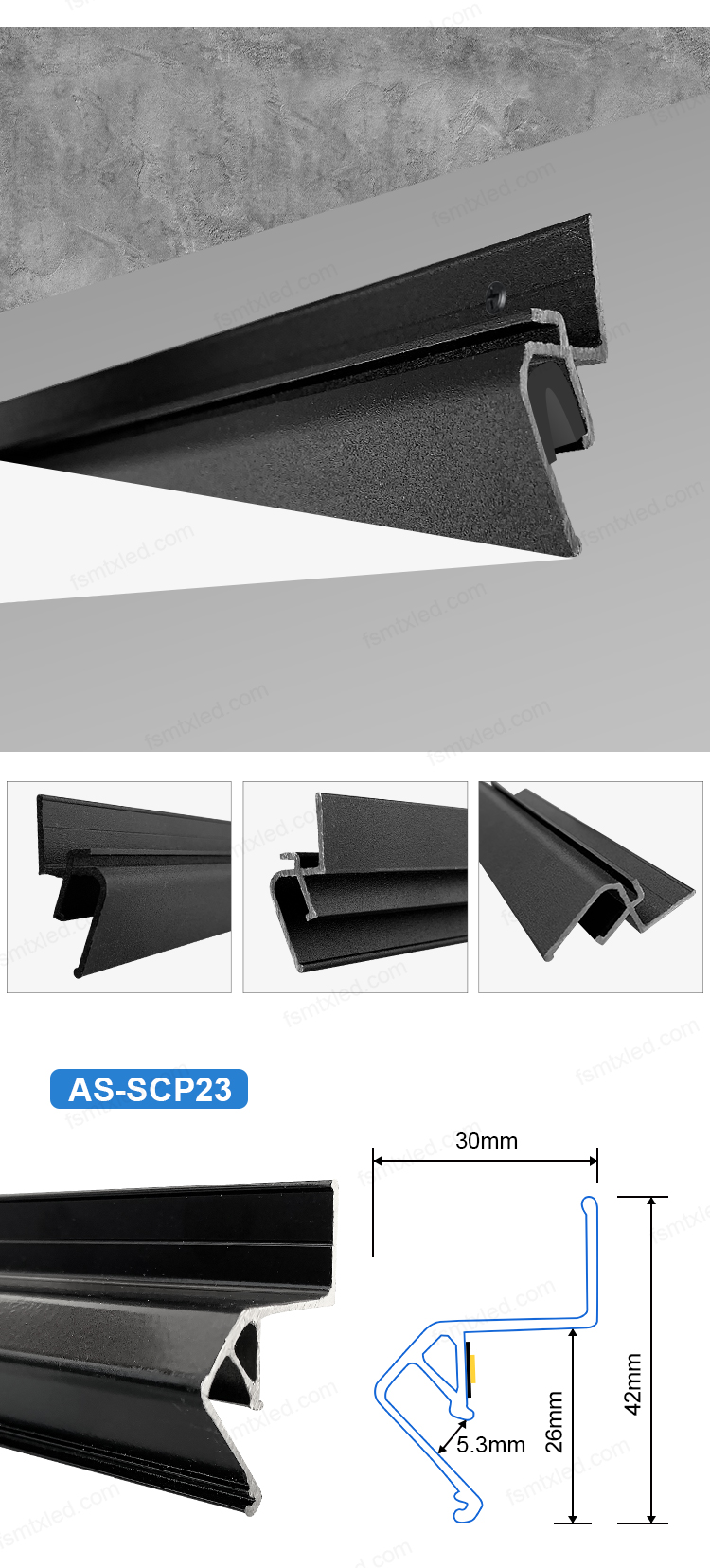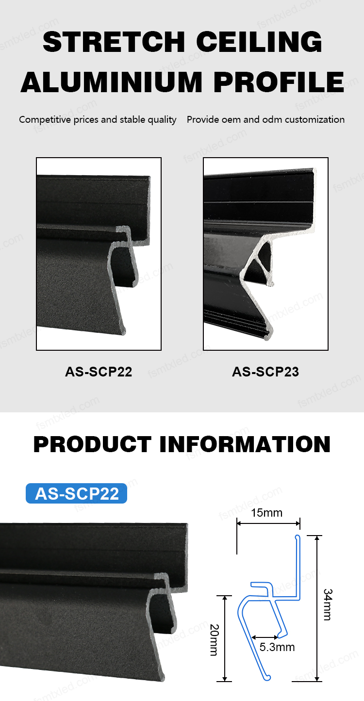 | The following is an introduction to two types of stretched ceiling aluminum profiles. These three profiles are used in combination with PVC film. Compared with traditional plaster ceilings, stretched soft film ceilings have significantly reduced costs, are much easier to install, and are also more convenient for later replacement! |