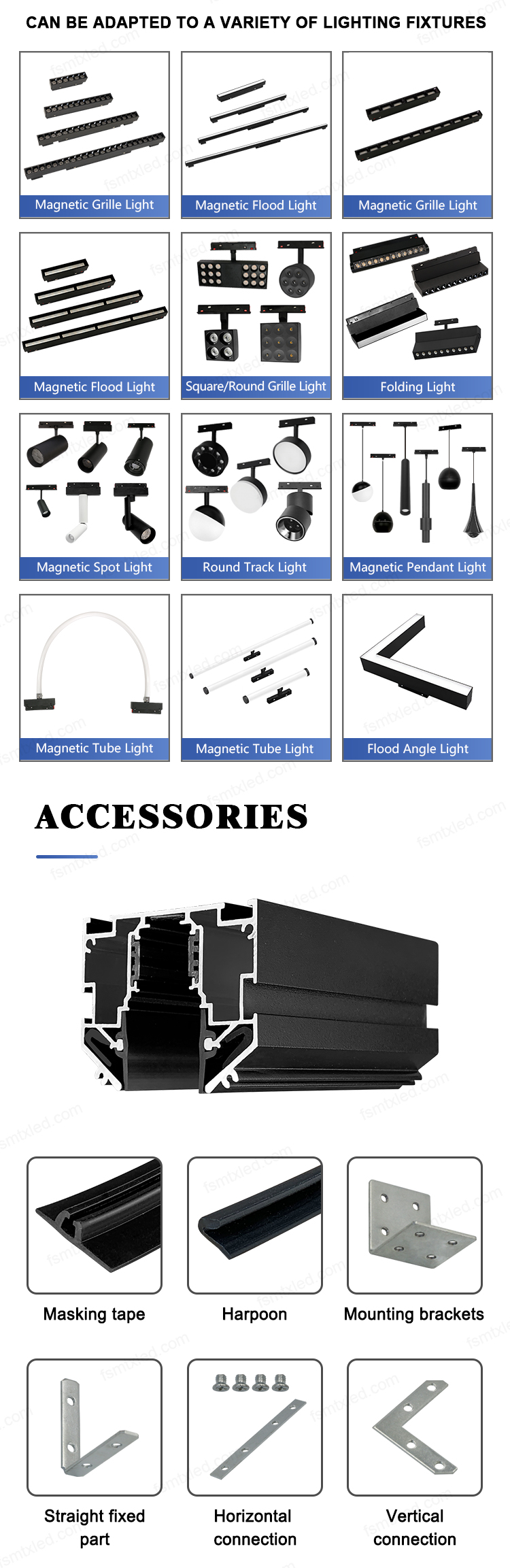 | Next, let's take a look at the compatible lightings and the corresponding accessories for this product. |