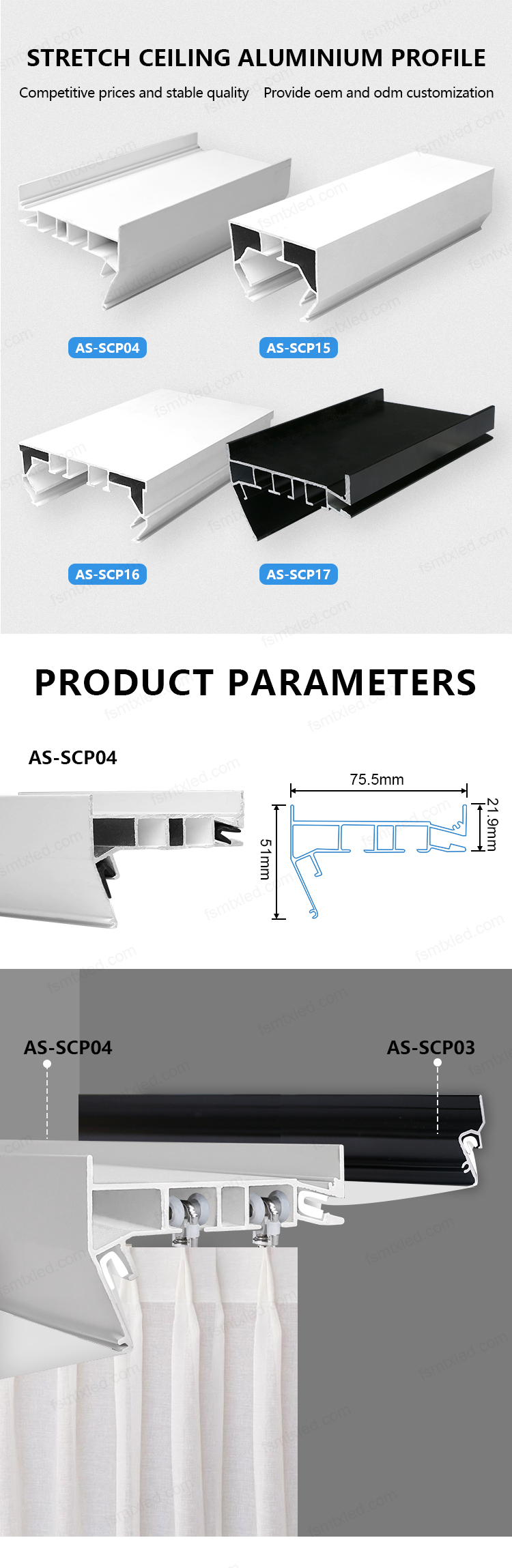 | Below are the introductions of several popular curtain stretching aluminum profiles. |