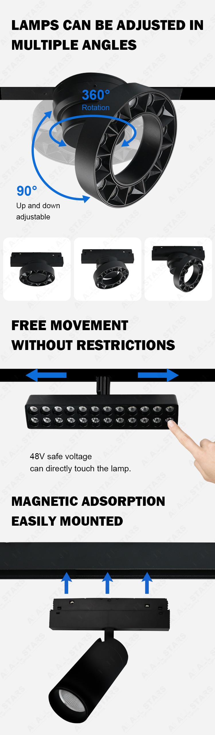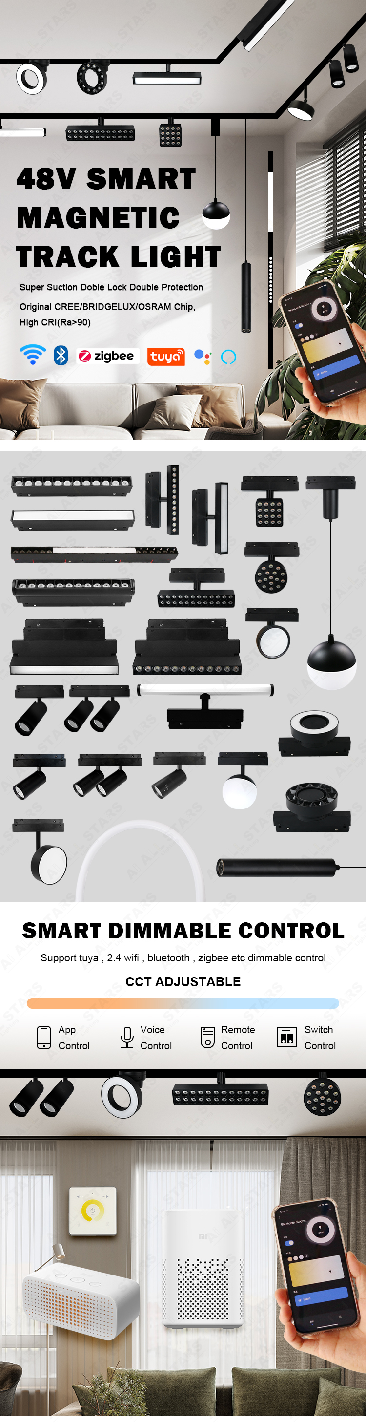 Introducing our 48V smart magnetic track light, whether you need to control individual lights or groups of them for synchronized effects, it offers flexible operation to adapt to any scenario. It is equipped with three smart systems - 2.4g wifi smart control, Bluetooth smart control and zigbee smart control - seamlessly integrated into the smart home setup, ensuring convenient connection and control.