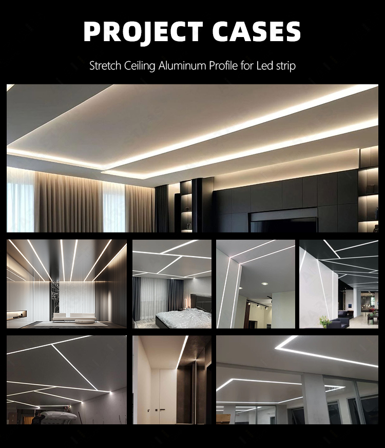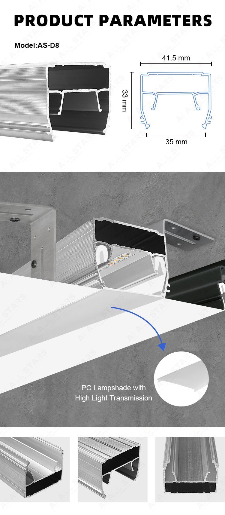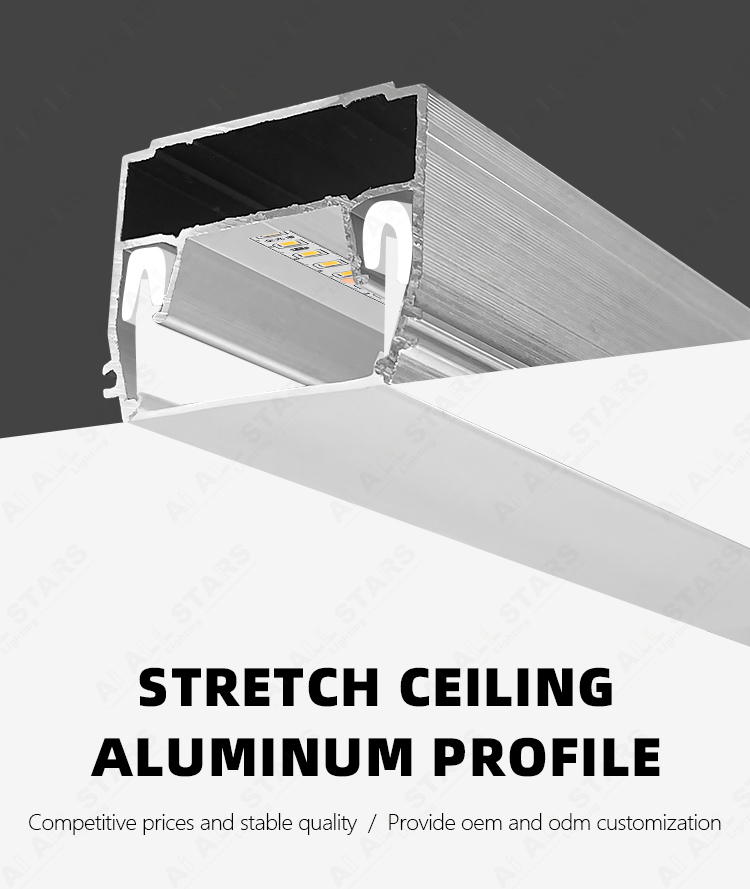 The AS-D8 light strip stretched ceiling profile can be used in combination with PVC film to form a stretched ceiling, or it can be used in conjunction with hidden light strips to achieve soft lighting.The installation of the stretched ceiling aluminum material is simple, and its maintenance cost is low. It is suitable for various scenarios such as homes, shopping malls, hotels, and offices.