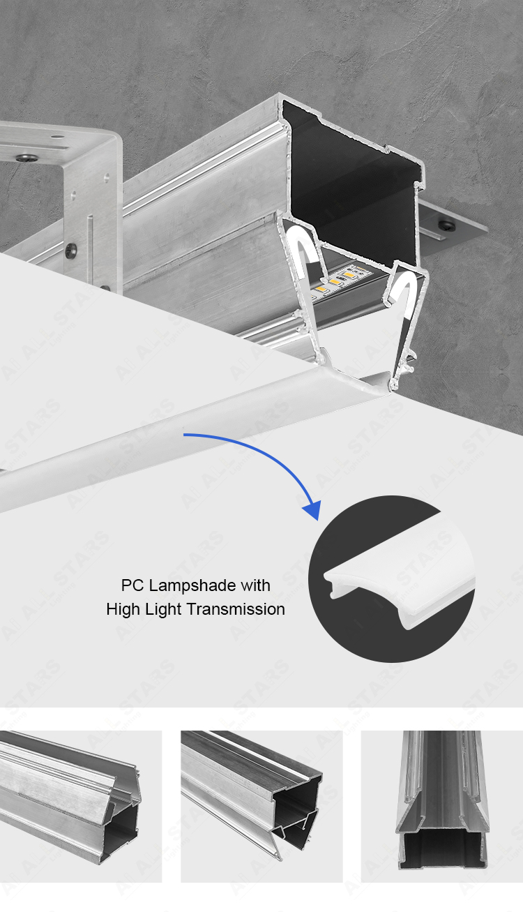 The AS-D9 light strip stretched ceiling profile can be used in combination with PVC film to form a stretched ceiling, or it can be used in conjunction with hidden light strips to achieve soft lighting.The installation of the stretched ceiling aluminum material is simple, and its maintenance cost is low. It is suitable for various scenarios such as homes, shopping malls, hotels, and offices.