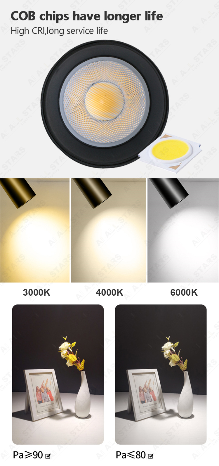 Good Heat Dissipation And High CRI LED COB Track light is our high-quality commercial luminaire,consisting of an aluminum body with a perfect heat sink, optical grade lens/reflectors and high CRI COB LED Chips and a perfectly led power supply.Thickened aluminium heat sinks are built in,and a plurality of heat dissipation and ventilation holes are designed on the back. The heat of the lamp body is distributed during its operation to ensure the stability of the temperature inside the lamp body Running more durable and safe,Available 10W 20W 30W 40W in wattage,it is the ideal choice for commercial residential museum showroom shop lighting projects.
