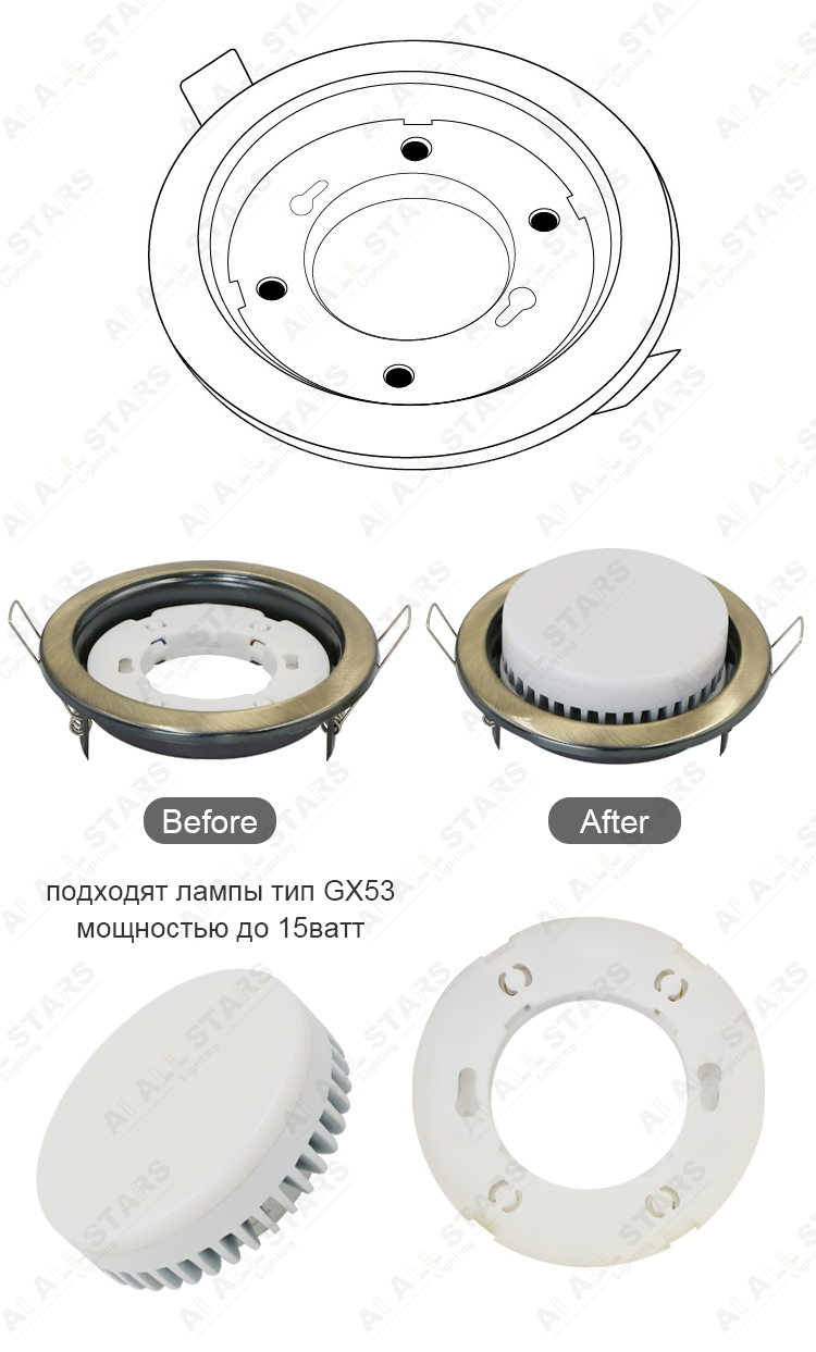 The luminaires are designed for use with LED lamps with GX53 base, designed for use in AC networks with a rated voltage of 100-265V, and having a power not exceeding 12W (the lamp is not included in the delivery set).