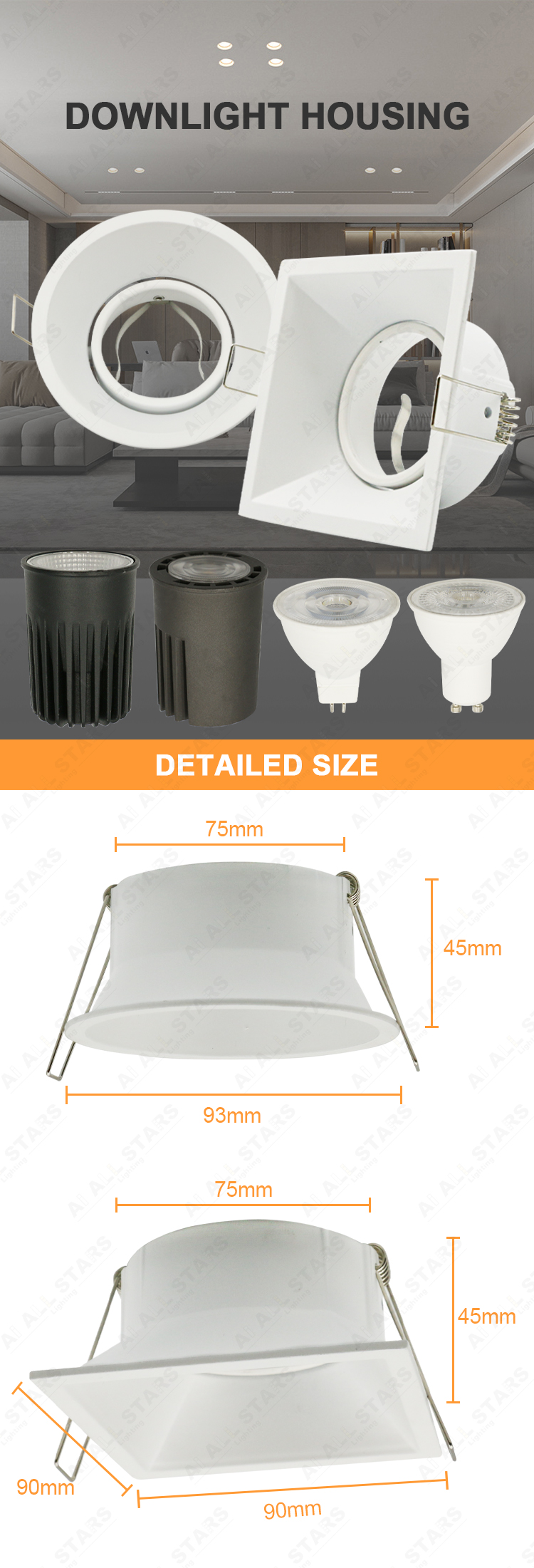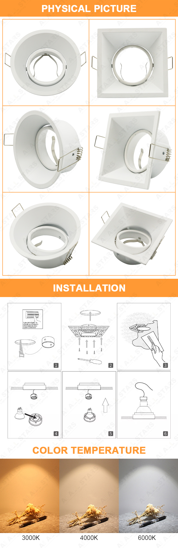 | Recessed MR16 Ceiling Downlight Housing Frame Lamp and GU10/GU5.3 Base, designed for 12V-AC100-240V voltage. GU10 or GU5.3 sockets are provided in the kit. The light characteristics of the luminaire depend on the bulb used in it (the bulb is not included in the scope of delivery). |