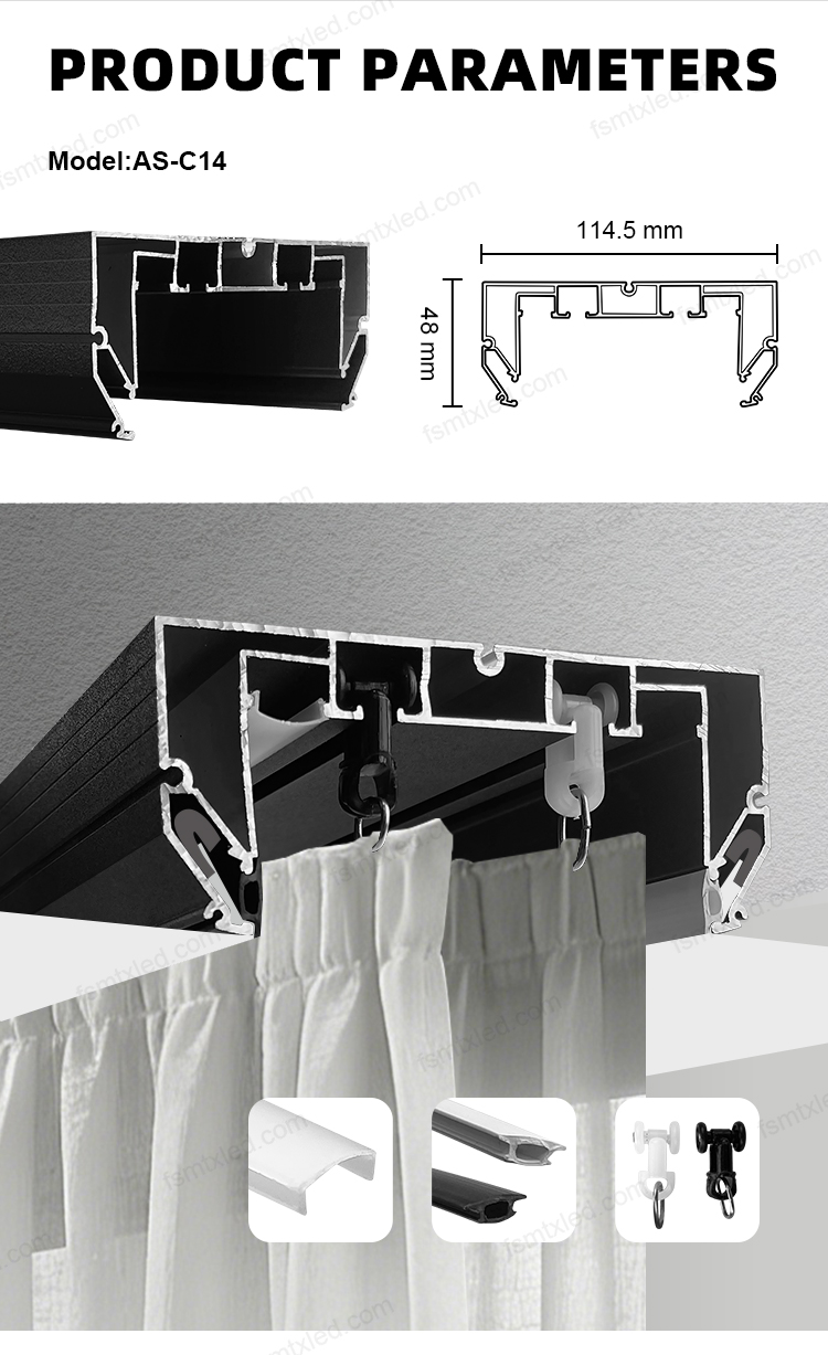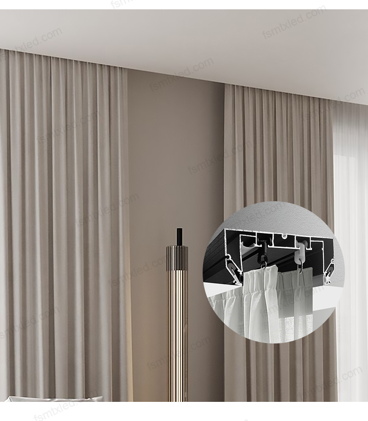 The curtain aluminium profiles are meticulously crafted from high-quality aluminium alloy. They are light in weight but very durable and corrosion-resistant. They can be combined with PVC film to form a raised ceiling, while ingeniously concealing the curtain tracks, making the overall space appear more neat and tidy. It not only meets the decorative requirements of the stretched ceiling but also ensures that the curtains are not exposed during installation.