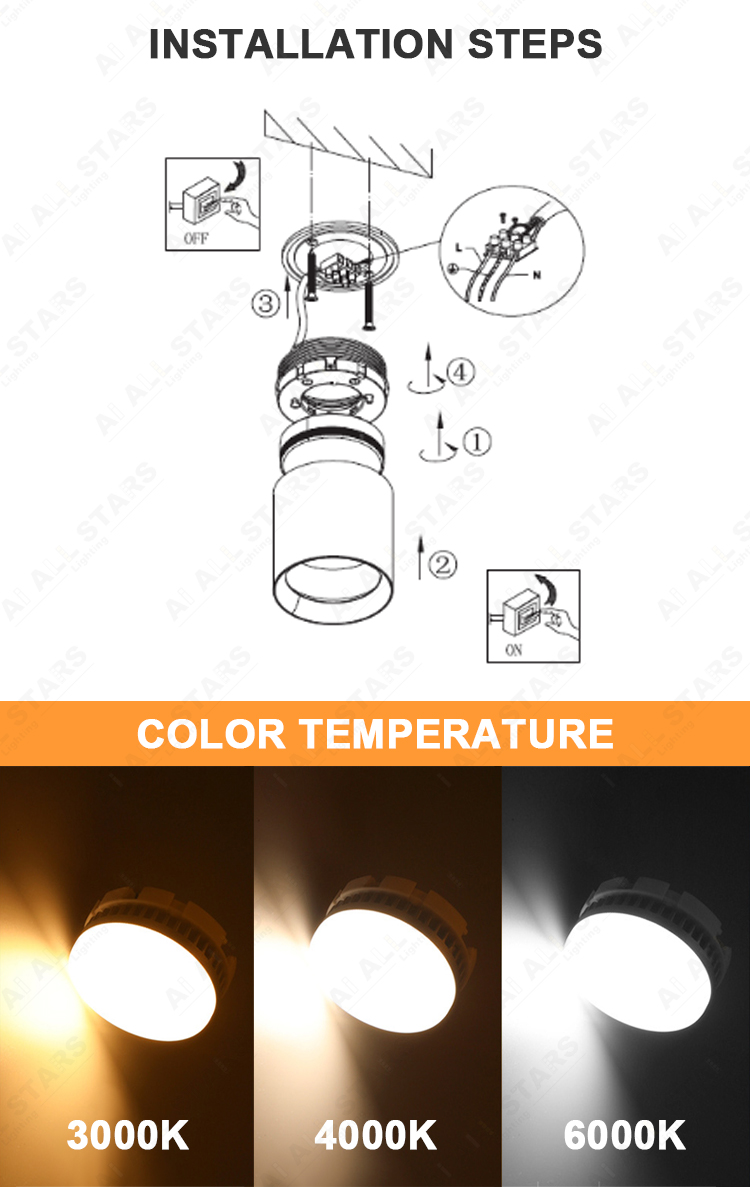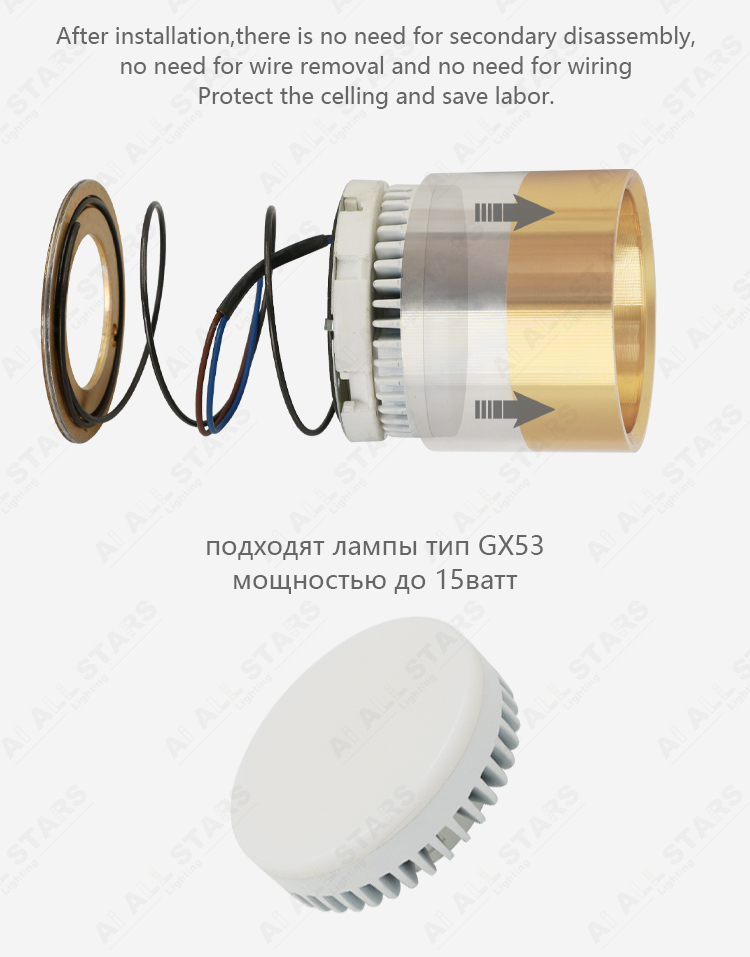 The luminaires are designed for use with LED lamps with GX53 base, designed for use in AC networks with a rated voltage of 100-265V, and having a power not exceeding 12W (the lamp is not included in the delivery set). Lights are designed for use only inside dry heated rooms.
