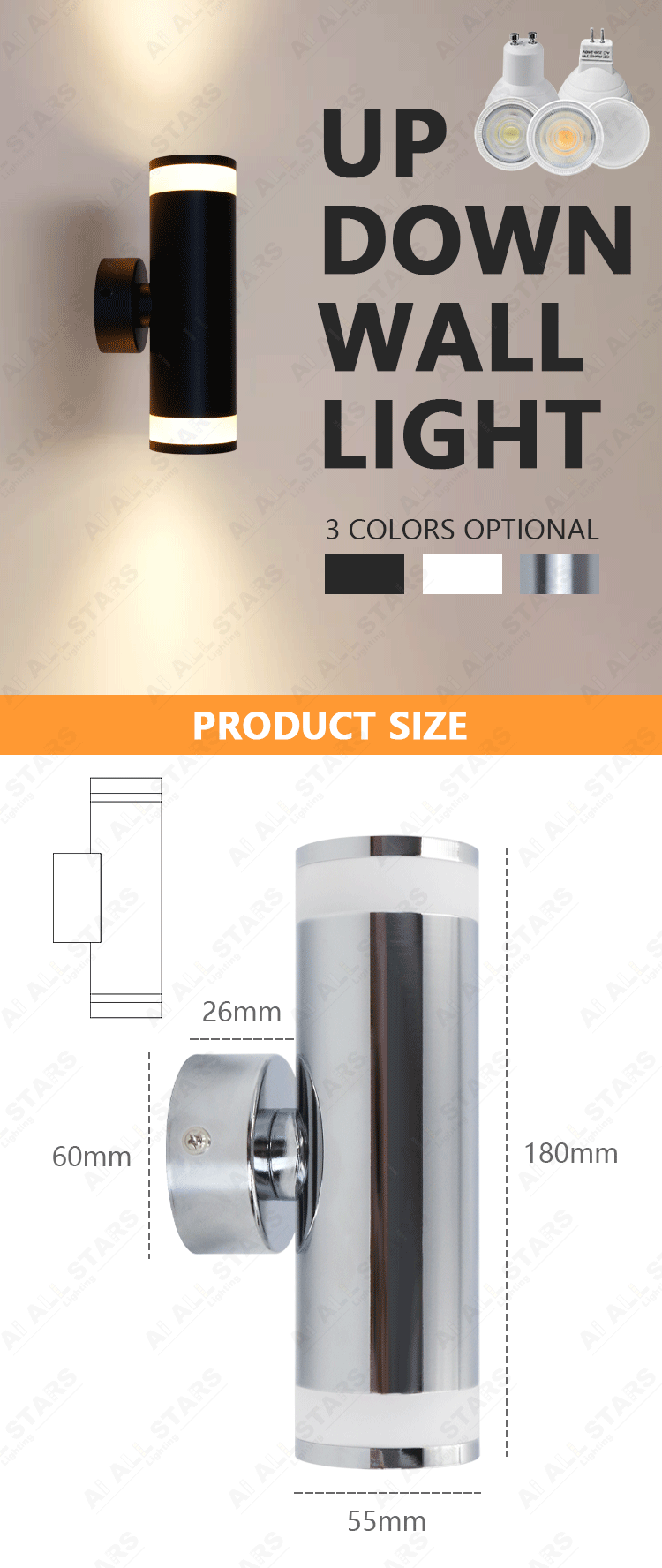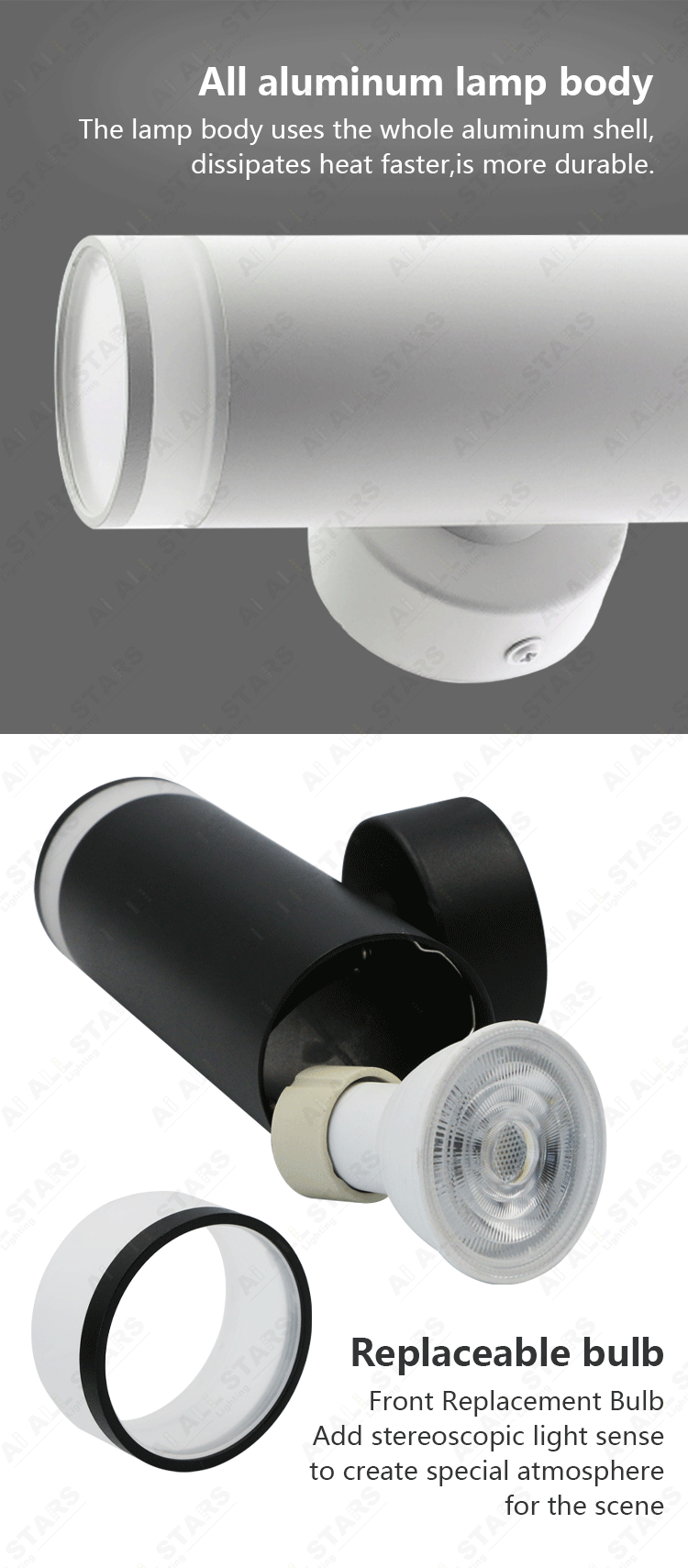 Wall lighting spots with aluminium body presents a long lifetime.This model includes GU10 socket for the desired lighting flexibility.It's ready to be operated with its easy installation and maintenance.
